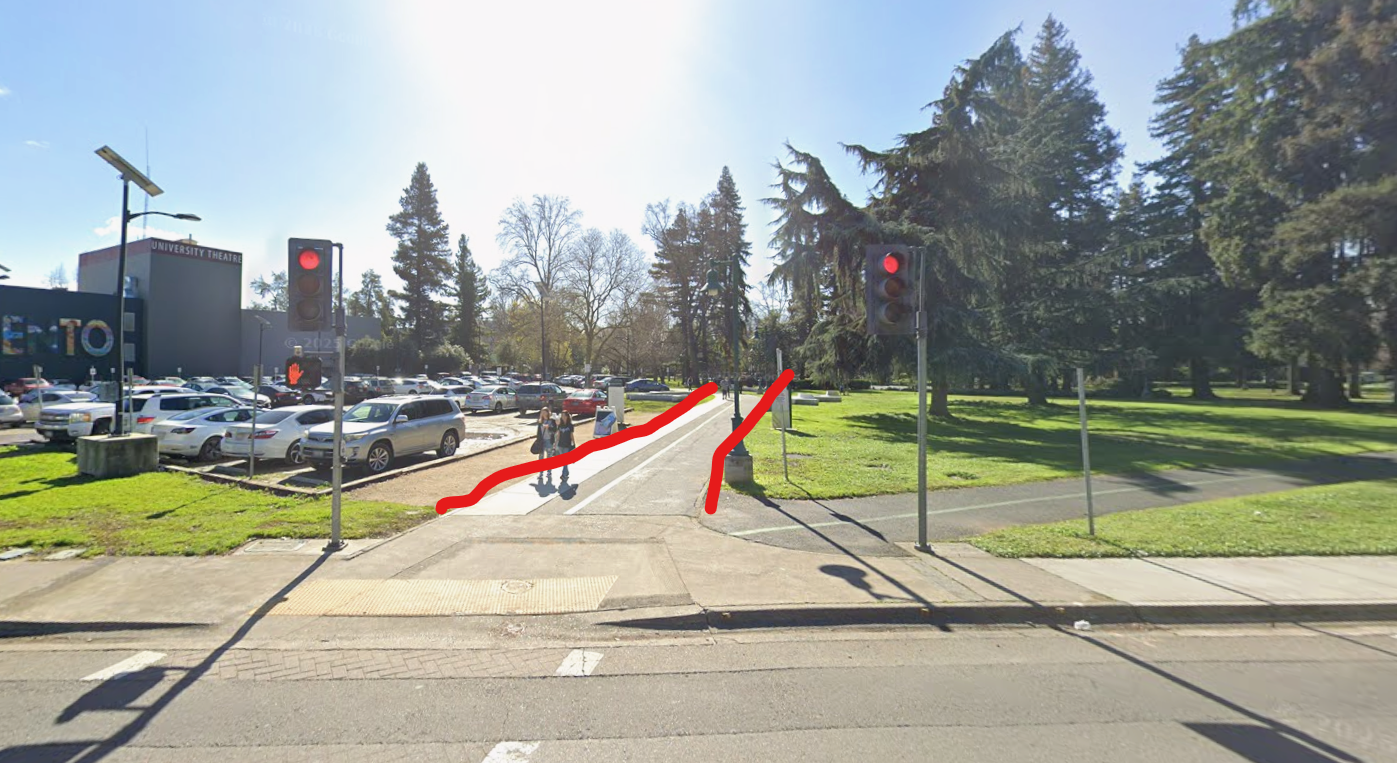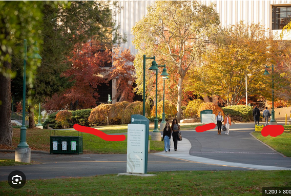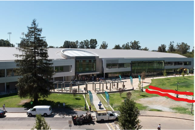 - Signed must be placed on the grass areas leading to the WELL, on the back side of Benicia Hall. The red lines indicate the walkway (a-frames must be placed on the grass areas) leading to the WELL.
